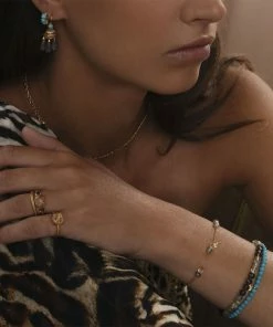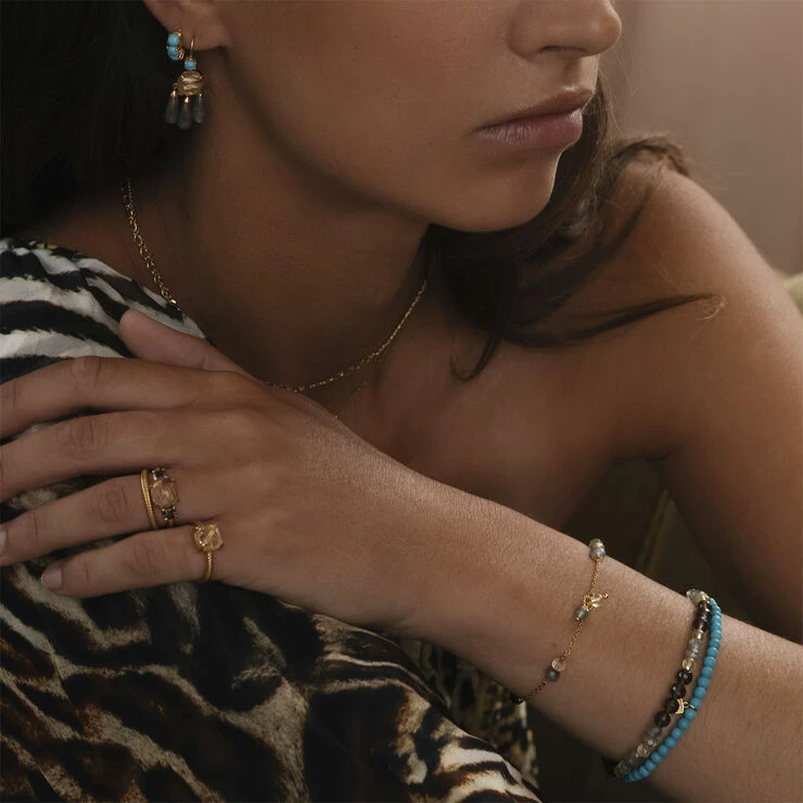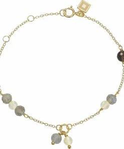 Armbånd i guldbelagt sterling sølv med labradorit, gylden rutil kvarts og røg kvarts. Det måler 16+1,5+1,5cm. Armbåndet tilhører Pasha kollektionen med dronning Kleopatra som muse.