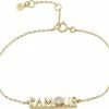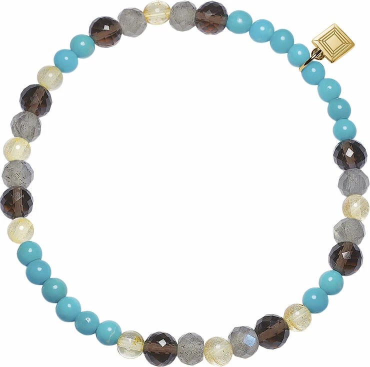 Armbånd i slip-on elastik med labradorit, gylden rutil kvarts, røg kvarts, turkis og Carré-tag i guldbelagt sterling sølv. Det måler 17,5cm. Armbåndet tilhører Pasha kollektionen med dronning Kleopatra som muse.