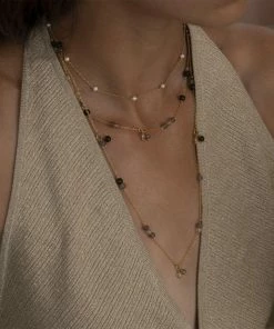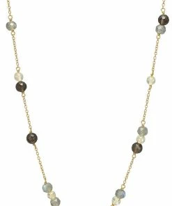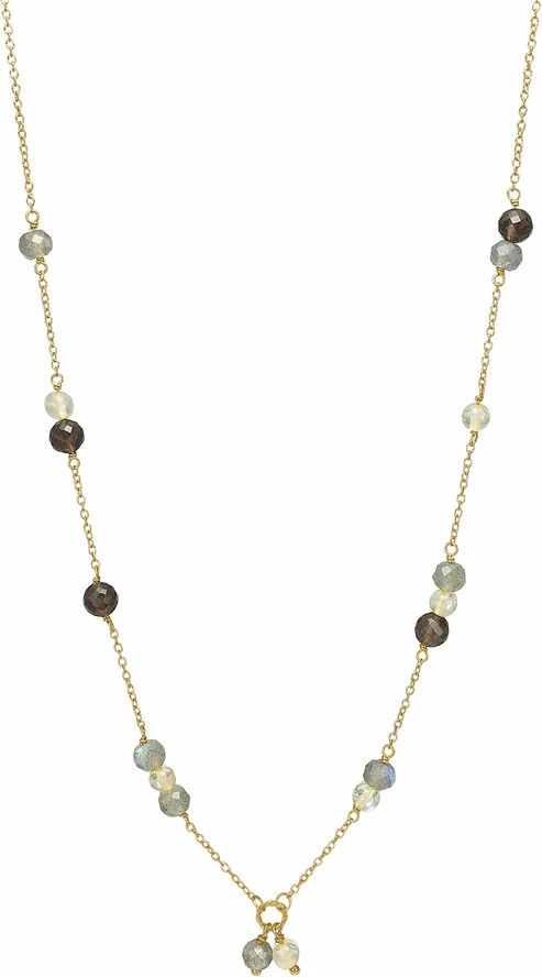 Kæde i guldbelagt sterling sølv med labradorit, gylden rutil kvarts og røg kvarts. Den måler 38+2,5+25cm. Kæden tilhører Pasha kollektionen med dronning Kleopatra som muse.