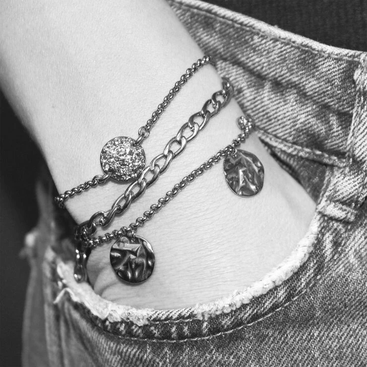 Optimer dit look med denne skønne og klassiske favorit, som du kan have på igen og igen. ARLENNA er et lille kædearmbånd med hamrede metalpoletter i banket finish. Et lille krystalvedhæng dekorerer kæden. Et råt men også feminint look. Poleret stål. Dansk og nikkelfrit design.