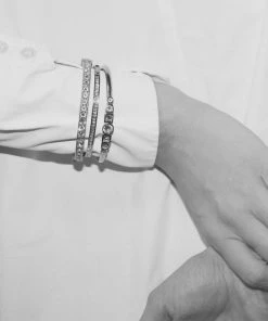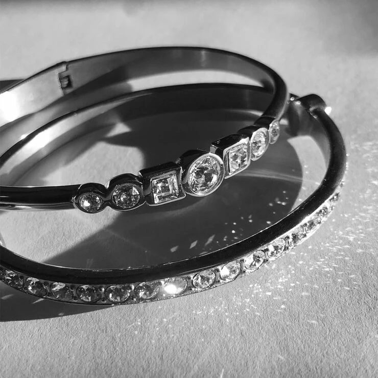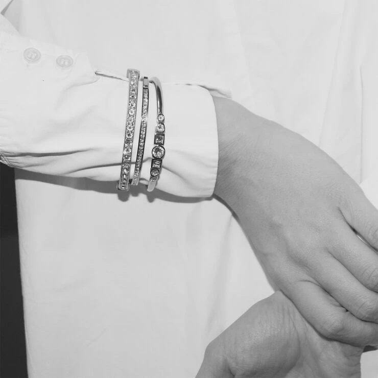 Metal armbånd i blankt stål med dekoration af runde klare Swarovski crystaller. Nickelfri.