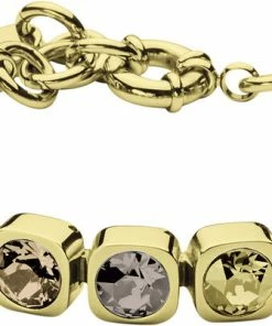 One of our bestsellers over time – classic and a real headturner: The chunky tennis bracelet CONIAN is made with crystals from Swarovski and stainless steel. Shown here in gold toned finish and golden/grey crystals. – Nickel free – Stainless steel – Closure: Spring lobster