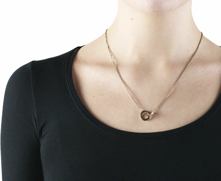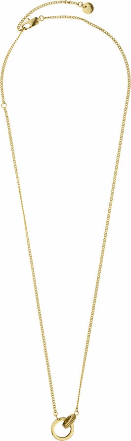 Halskæde med to sammenflettede ringe der har et unikt rillet finish. 50 cm + forlængelseskæde.