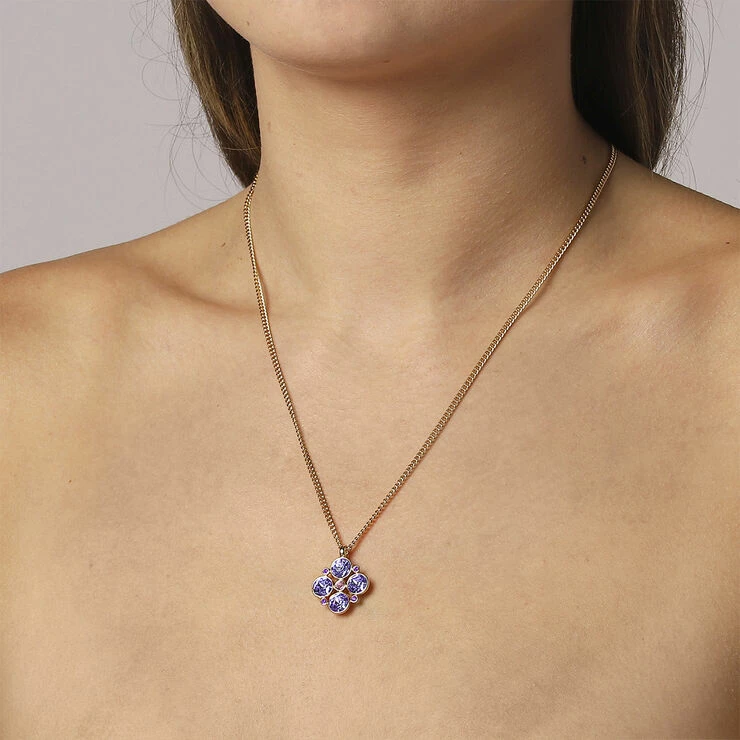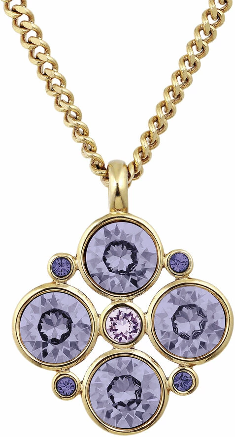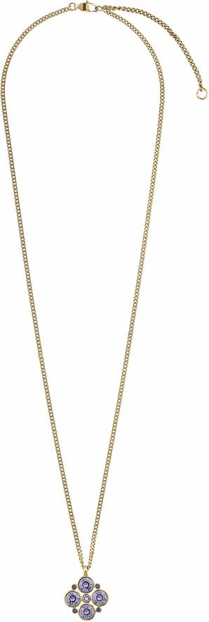 MAUDE – lige dele blomsterinspiration, lige dele gotisk elegance demonstreres i dette halsmykke, der er ca 40 cm langt med 5 cm forlængerkæde. Kæde og vedhæng er lavet i stål og belagt en kvalitetsbelægning. Motivet er markant og viser et miks af sæsonens smukke farver. Stenene er Swarovski krystaller, og de er isat med præcision i den moderne box-setting. Her vist i usædvanlige lavendel og violette krystaller monteret på guld tonet stål. Et smykke der smykker….og iøvrigt passer til ørenringen MIA..