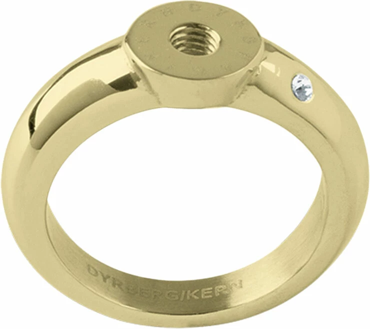 Fra vores fleksible COMPLIMENTS collection har vi her ringen RING 5, der er kreeret i stål i en smuk guldtonet finish, der er smukt poleret og isat en diskret Swarovski krystal på den ene side – enkelt og smukt. Brug denne ring som base for et væld af smukke toppings hvor du selv isætter og dermed designer din egen ring efter dit humør. Kun din egen fantasi sætter grænsen. Se størrelsesangivelse andetsteds på sitet. Nikkelfri, allergistestet og dansk DYRBERG KERN design.