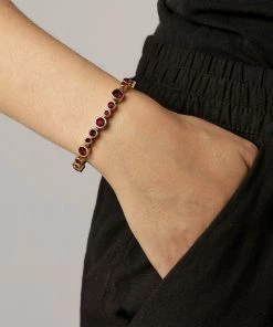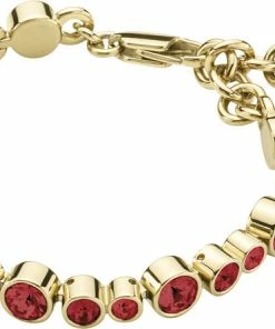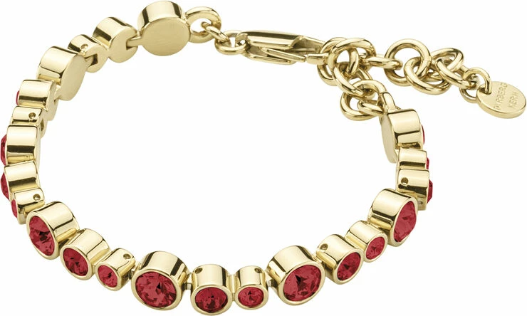 TERESIA – En ægte bestseller – og et klassisk armbånd der virkelig drager opmærksomhed: TERESIA er et af vores mest markante tennisarmbånd med større og mindre, smukt sammensatte Swarovskikrystaller – selvfølgelig designet i rustfrit stål. Her vist i poleret guldtonet finish og smukke røde krystaller. Dansk design.<br><br>- Nikkelfri<br>- Rustfrit stål<br>- Lås: Karabinlås
