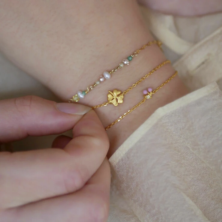 Om smykket- Organisk og fint kløverarmbånd med smagfulde detaljer. Firkløveren er et gammelt symbol på lykke, og bringer held til den der bærer den. Vores kløverarmbånd er til dig, der elsker symbolik og affektionsværdi i smykker, og ønsker at give eller eje et smykke, der aldrig mister sin betydning. Der er også matchende ørestikker og halskæde.