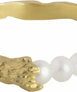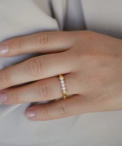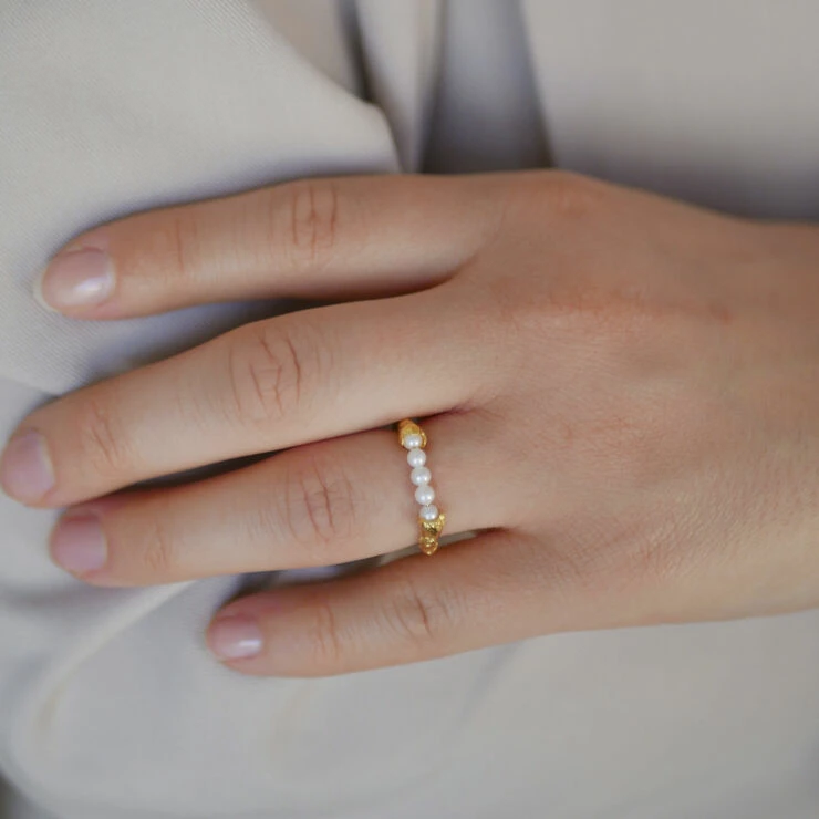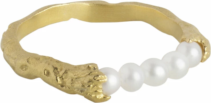 Om smykket- Ailana ringen minder om en simpel rund ring, men bliver brudt af en række perler. Den har kant og elegance på samme tid, og er en simpel måde at gøre din sammensætning af ringe helt speciel. Ailana ringen kan bruges på flere forskellige måder. Du kan enten sætte den skønne perlerække opad, som så fint viser hvordan metalet omkranser perlerne eller du kan vende perlerækken nedad, og du får en simpel, men rå ring, hvis du ønsker et mere afdæmpet look. Ailana ringen er også rigtig god at stacke, hvis du godt kan lide at have flere ringe på samme finger.