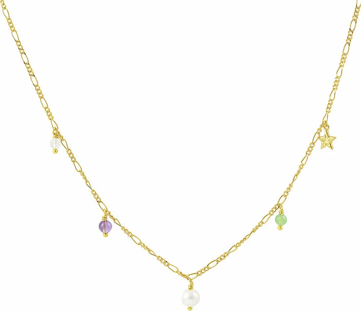 Forgyldt sterlingsølv. Mål: Længde 42 cm + 5 cm. Materialer: Prehnit, ferskvandsperle, kunzit, månesten.