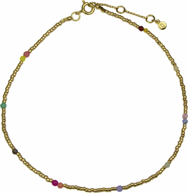 Anklet. 18K gold plated sterling silver with coloured beads. Length: 23 cm + 3 cm flex