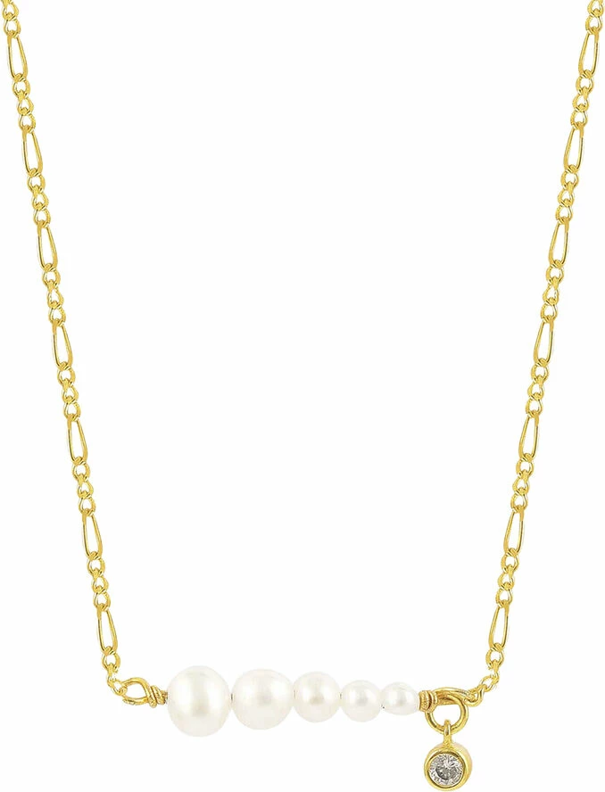 The Elaine necklace has 5 descending freshwater pearls and 1 white cubic zirconia hanging on the site. Quality: 18K gold plated sterling silver. We have applied 1 micron and e-coating to make the gold plating last. Dimensions: 41 cm + 5 cm flex