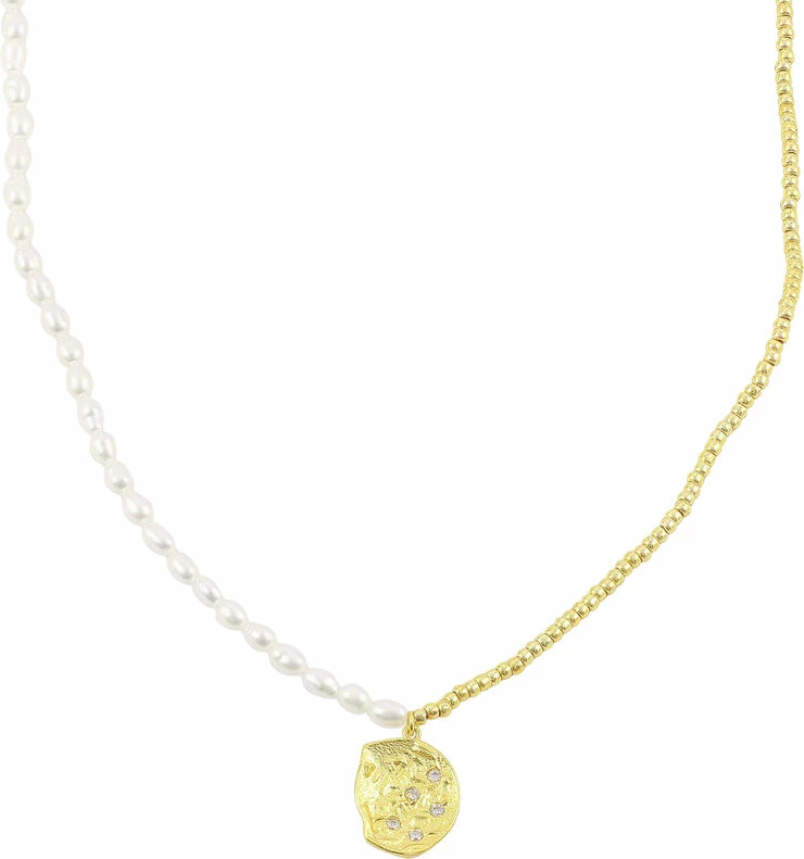 The Ella necklace has a chain made of small freshwater pearls on one site and gold plated beats on the other. The pendant is hammerhit and has 5 cubic zirconia. Quality: 18K gold plated sterling silver. We have applied 1 micron and e-coating to make the gold plating last. Dimensions: 35 cm + 5 cm flex.