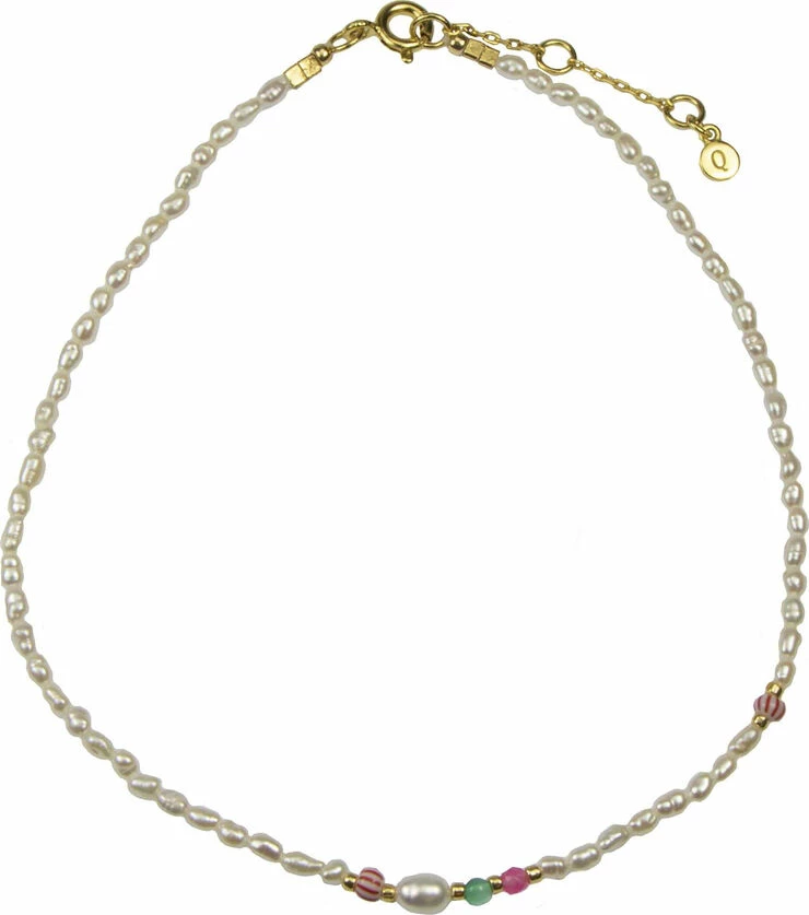 Anklet. 18K gold plated sterling, freshwater pearls and coloured beads. Length: 23 cm + 3 cm flex