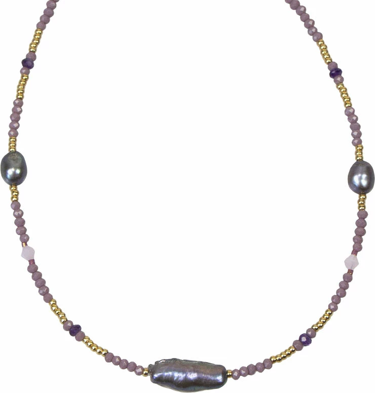 Forgyldt sterlingsølv. Dimensioner: Længde 35 cm + 5 cm. Materialer: Farvede perler, ferskvandsperler.