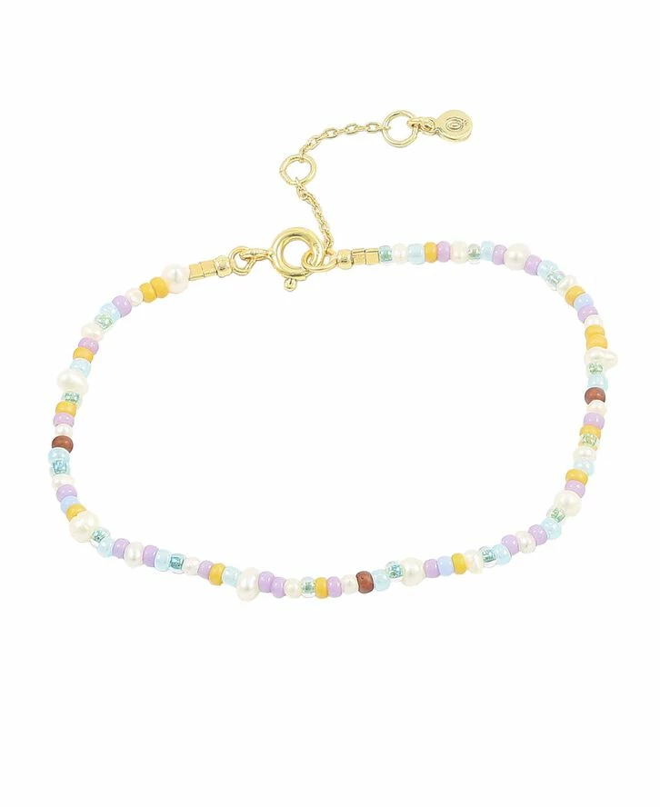 Sterling sølv forgyldt med 18 karat guld, ferskvandsperler og miyuki perler. Længde: 16 cm + 3 cm flex.