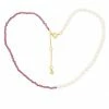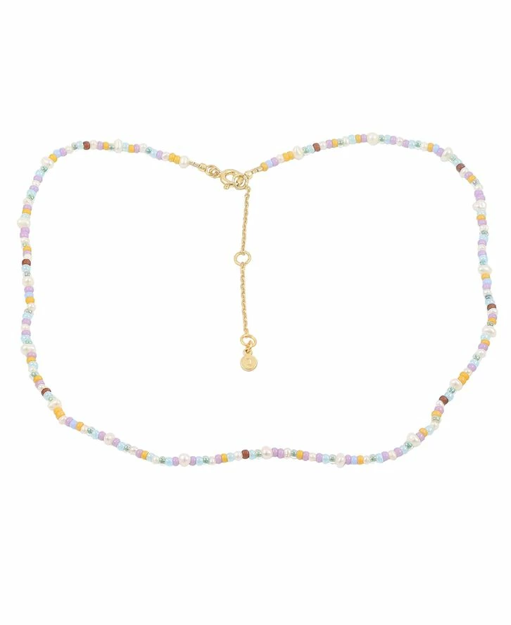 Sterling sølv forgyldt med 18 karat guld, ferskvandsperler og miyuki perler. Længde: 35 cm + 5 cm flex.