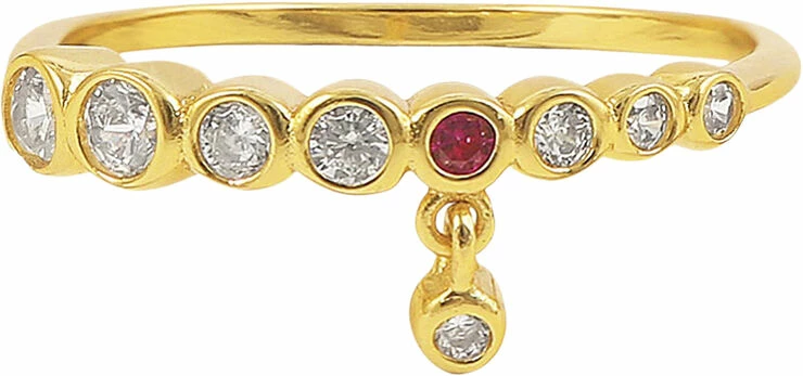 The Ruby ring has 8 and 1 ruby coloured cubic zirconia. Quality: 18K gold plated sterling silver. We have applied 1 micron and e-coating to make the gold plating last. Dimensions: size 50, 52, 55