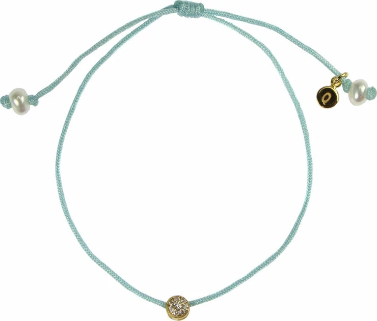 Bracelet. 18K gold plated sterling silver with white cubic zirconia on a blue cord with white freshwater pearls. 15 cm + flex