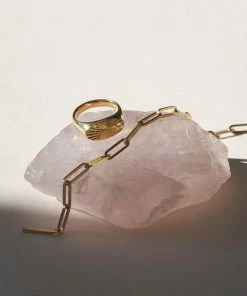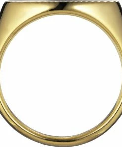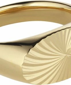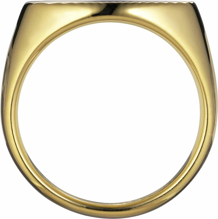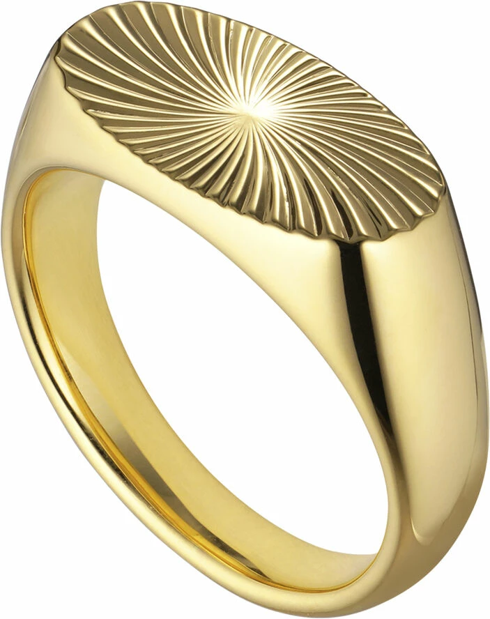 Reflection Signet ring i18 karatforgyldt sterlingsølv med en smuk centreret gravering på toppen af ringen. Ringen måler 9,5 mm. i overfladen. 2 micron guldbelægning. Jane Kønig har med denne ring re-fortolket den klassiske signet ring. Dette er hendes bud på hvordan nutidens signet ring bør se ud. Den store overflade fylder godt på fingeren, og den smukker lysspil som mønsteret kaster fra sig, tillader ingen at ignorere denne smukke ring.