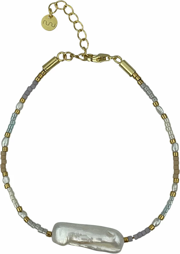 Hndlavet armbnd med Ferksvandsperler, Barok ferskvandsperle, glasperler og forgyldt sterling s¿lv