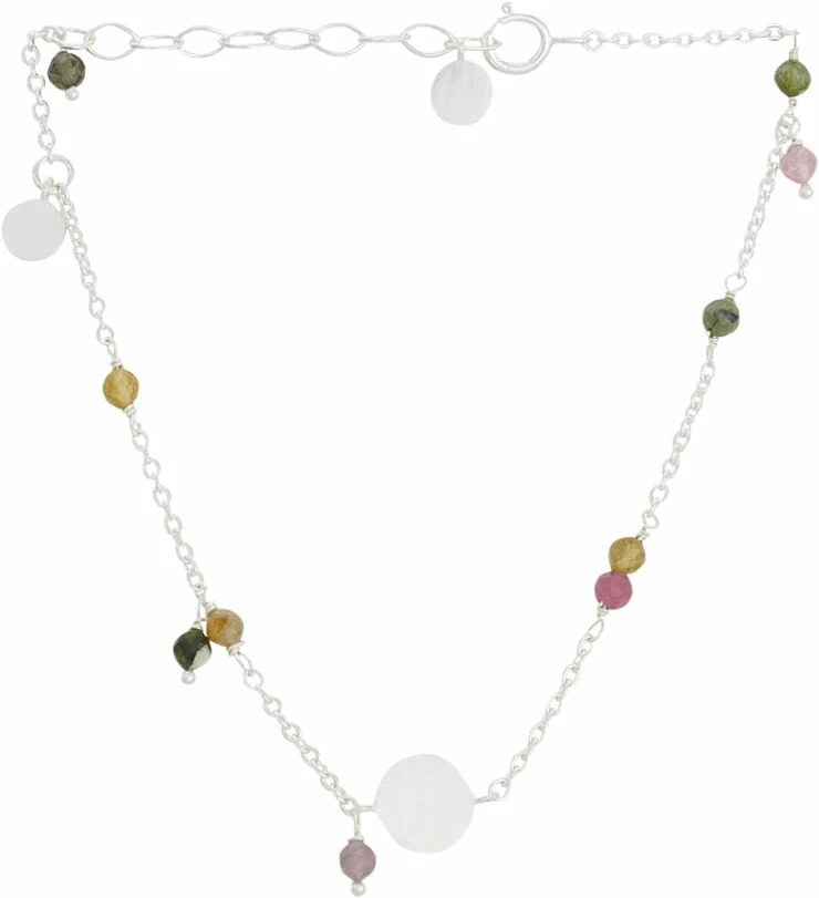 Armbånd med små mønter og sten i smukke pastel farver. Str: 15-18 cm, justerbar. Sten: Rainbow Turmalin