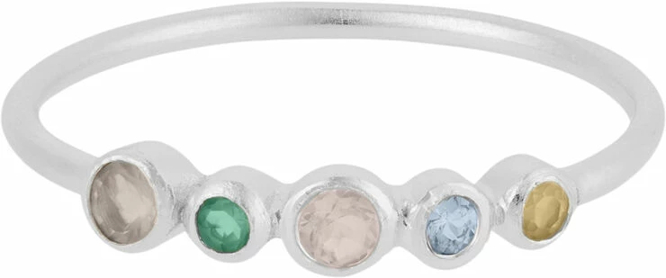 Stardust Ring. Stardust Ring er udsmykket med skinnende stjernesten, som hver siges at besidde sin helt egen særlige kraft. Er du også spændt på at se, hvad der står skrevet i stjernerne for dig? Str: 52, 55 Se vores ringstørrelsesguide her (link: https://dk.pernillecorydon.com/ring-stoerrelsesguide) Sten: Rosenkvarts, Grøn Chalcedony, Grå Månesten, Akvamarin, Gul Agat
