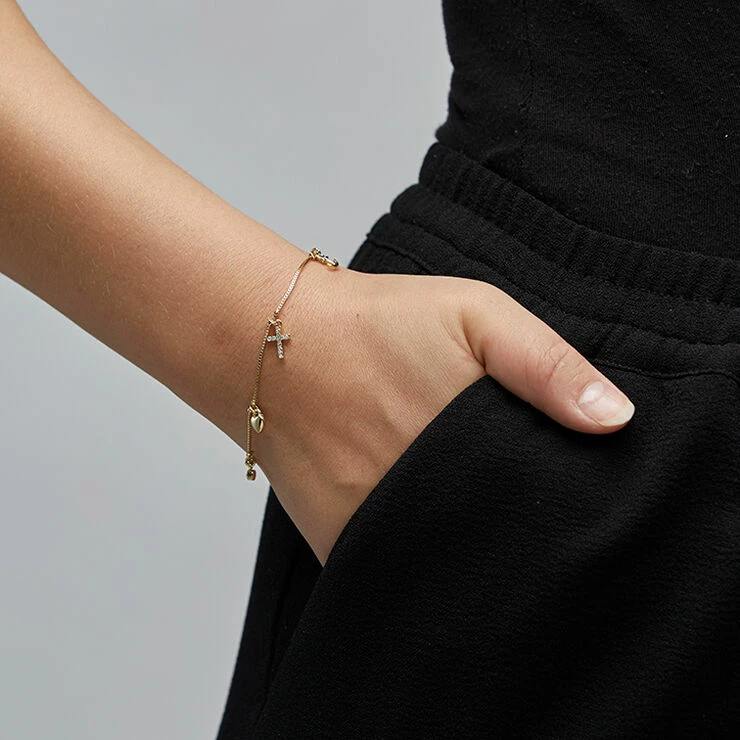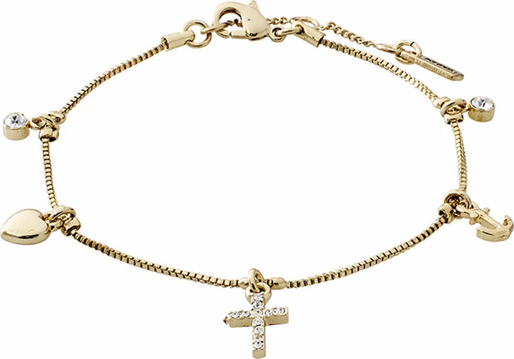 Guldbelagt armlænke med tre smukke vedhæng, der symboliserer tro, håb og kærlighed. Armlænken har desuden to vedhæng af indfattede Preciosa-krystaller. Hjertet og ankeret har en fin buttet form, og korset er prydet med funklende krystaller. Et armbånd med klassiske symbolske motiver i et funklende design med et smukt og let udtryk.