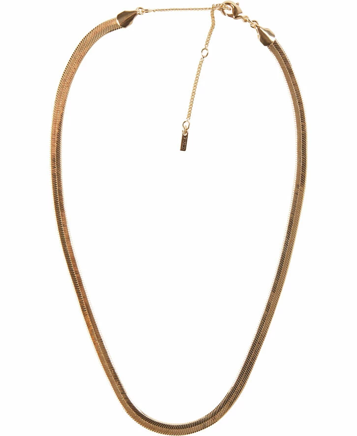 Guldbelagt, blank slangehalskæde, der fremstår som et bredt bånd med smuk struktur. Halskædens mange flade led skaber et fascinerende mønster og ligger sig flot om halsen. En stilren halskæde med et karakterfuldt og lidt eksotisk look. Er smuk alene, men kan også kombineres med andre af Pilgrims skønne halskæder.