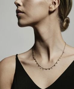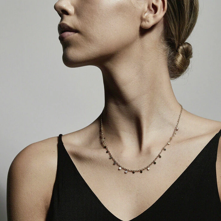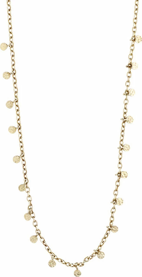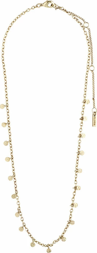 Feminin guldbelagt halskæde med små blanke runde vedhæng langs kæden. Den delikate halskæde er 40 cm lang og har 9 cm forlængerkæde. Designet er inspireret af klassiske eksotiske smykker, og halskæden er perfekt som kontrast til et råt outfit. Lad din femininitet stråle igennem med denne skønne klassiker.