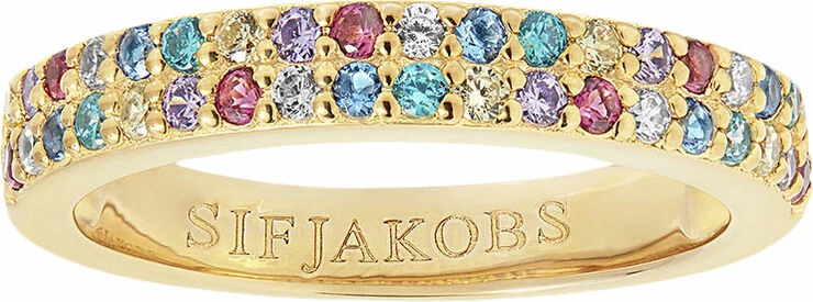 Ring i sterlingsølv 925 forgyldt med 18 karat guld med blankpoleret overflade og facetslebne multifarvede zirkoner. <br>Ringens mål: Bredde 3 mm<br><br>Guide til at finde din ringstørrelse:<br><br>Der findes flere forskellige metoder til at måle sin ringstørrelse på. Vi anbefaler følgende tre måder. <br><br>Prøv eventuelt flere af metoderne og sammenhold resultaterne for at undgå fejl.<br><br>1. Mål den indvendige omkreds af din ring med et målebånd. Hvis omkredsen er 56mm svarer det til en størrelse 56.<br><br>2. Tag et stykke tråd og bind det løst rundt om den finger du ønsker at opmåle. Derefter måler du længden af snoren, hvilket svarer til din størrelse. Hvis snoren eksempelvis er 56 mm lang, vil dette svare til en størrelse 56.<br><br>3. Gå til en guldsmed og få opmålt din størrelse.