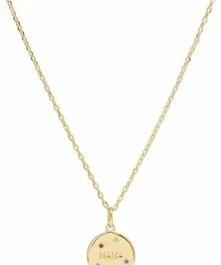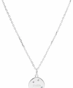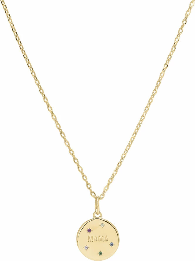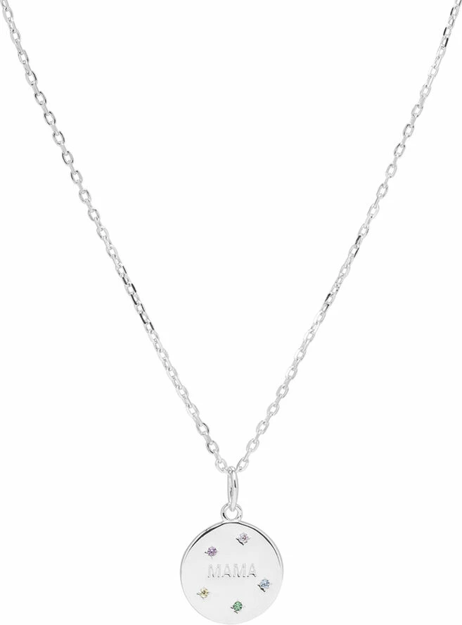 Fineste halskæde med teksten mama indgraveret. Halskeden har fem små farverige zirkoner.